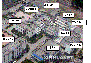 除旧教工宿舍N之外,其余建筑2006年建成,为同一设计院按GB50011-2001《建筑抗震设计规范》设计,同一施工单位建造,且处于同一场地,因此对建筑抗倒塌研究有很大的价值。 漩口中学各建筑的震害